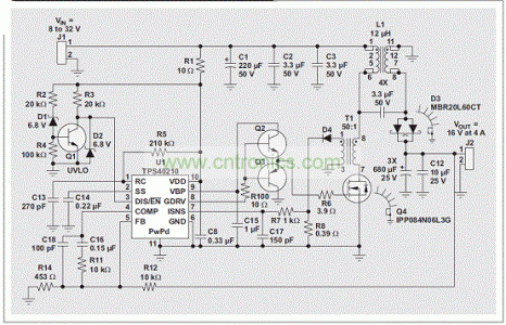 使用一個耦合電感的設計是典型的 64W 輸出功率車載輸入電壓范圍。方程式1表明,耦合電感要求 12 µH 的電感,以及 13 A 的組合電流額定值(基于 IIN + IOUT)。這種設計特別具有挑戰性,因為現貨電感選擇范圍有限。因此,我們指定并設計了 Renco 自定義電感。該電感纏繞在一個分離式線軸上以產生漏電感,旨在最小化能夠引起損耗的循環 AC 電流。產生這些損耗的因為,施加在漏電感的 AC 電容紋波電壓。若想實施低功耗設計,Coilcraft(MSS1278 系列)和Coiltronics(DRQ74/127 系列)的耦合電感均是較好的現貨產品。