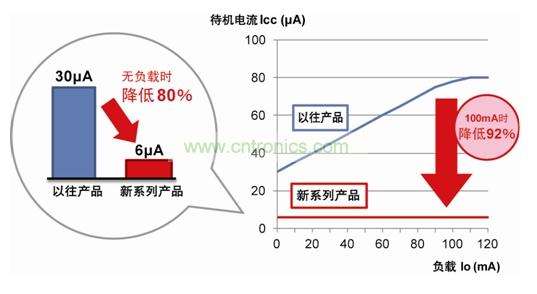 與以往產品相比,待機電流降低80%。而且,即使負載電流增加,新系列產品亦可維持6μA的待機電流,因此在負載100mA時,待機電流可降低92%。