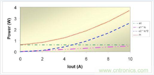 如果意識(shí)到電源損耗與輸出電流相關(guān)(可用輸出電流替換 X),那么系數(shù)項(xiàng)就能很好地與不同來(lái)源的電源功率損耗聯(lián)系起來(lái)。例如,ao 代表諸如柵極驅(qū)動(dòng)、偏壓電源和磁芯的固定開(kāi)銷損耗以及功率晶體管 Coss 充電與放電之類的損耗。這些損耗與輸出電流無(wú)關(guān)。第二項(xiàng)相關(guān)聯(lián)的損耗 a1 直接與輸出電流相關(guān),其典型表現(xiàn)為輸出二極管損耗和開(kāi)關(guān)損耗。在輸出二極管中,大多數(shù)損耗是由于結(jié)電壓引起的,因此損耗會(huì)隨著輸出電流成比例地增加。