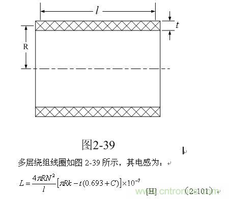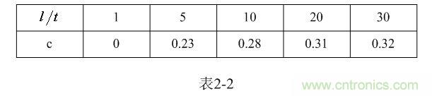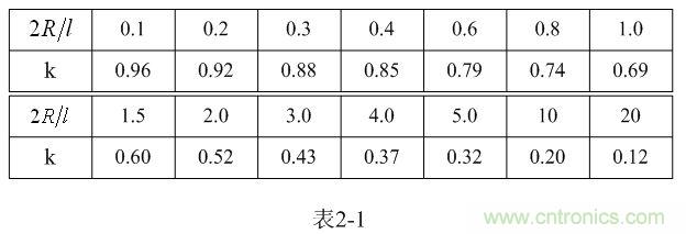 【說明】上式是用來計算多層線圈繞組、截面為圓形的空心線圈的電感計算公式。長岡系數(shù)k可查閱表2-1,系數(shù)c可查閱表2-2。當線圈內(nèi)部有鐵芯時,有鐵芯線圈的電感是空心線圈電感的