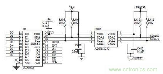 OZ89采樣模塊將采集處理后的數據通過I2C總線發送到LF2407,由于LF2407自身不帶I2C 接口,本設計利用PCA9564擴展其I2C接口。為了防止電磁干擾影響I2C總線上數據的傳輸,必須對總線信號進行隔離,考慮到I2C 總線是雙向傳輸的,使用ADuM1250雙向隔離芯片進行隔離。PCA9564及雙向隔離電路如圖2所示。