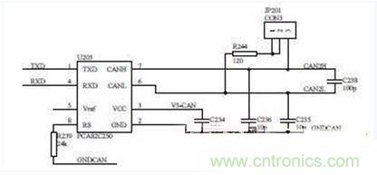 在電路中可根據整車要求,是否接入120Ω的終端電阻,當JP201跳線接1腳和2腳時,不接入電阻,當接2腳和3腳時,電阻接入。