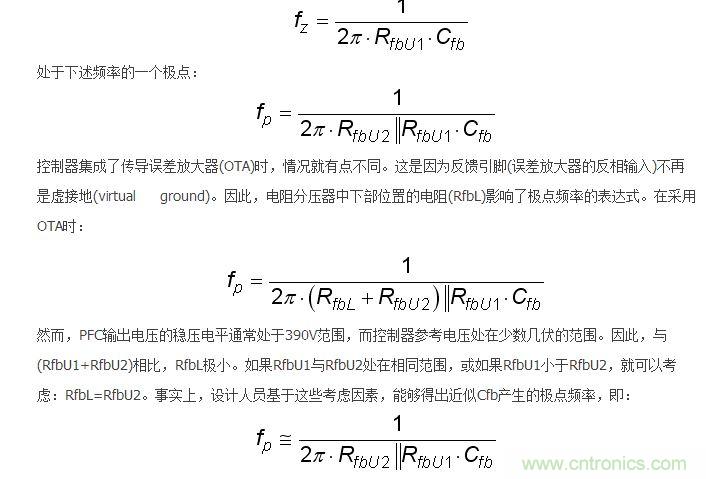 如果RfbU1與RfbU2處在相同范圍,低頻增益就略微增加,交越頻率就跟隨fp與fz的相同比率增加。如果與RfbU2相比RfbU1極小,我們就獲得在控制至輸出傳遞函數(shù)中抵消(cancel)的極點(diǎn)和零點(diǎn)。這樣,增加Cfb就對(duì)環(huán)路和交越頻率沒(méi)有影響。事實(shí)上,特別是在RfbL=RfbU2時(shí),這個(gè)增加的電容并不會(huì)大幅改變PFC段的動(dòng)態(tài)性能。