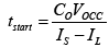 在啟動開始時,輸出電容器的平均充電電流為正值,充電電流等于(IS-IL),如等式1所示。在VO上升至VOCC之前,輔助匝電壓低于VDD,此時CDD無法通過輔助匝充電。但在此期間,CDD會被Irun和柵極驅(qū)動電流放電。如果 VDD低于VDD(off),UCC28700器件就會關(guān)斷。為確保器件順利啟動,在ta內(nèi)VDD必須大于VDD(off)。在等式8和等式9中,應(yīng)用了一個臨界條件。Tstart是VO從0上升至VOCC的時間。等式2是VOCC和VDD(off)的關(guān)系。在等式8 中,有1mA的估計柵極驅(qū)動電流,而且為VDD添加了1V的裕度。VCST是芯片選擇閾值電壓。在啟動開始時,UCC28700 VS引腳上的電壓為低,因此VCST保持其最大值。