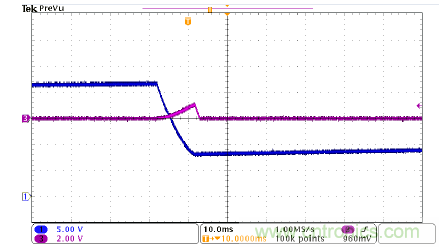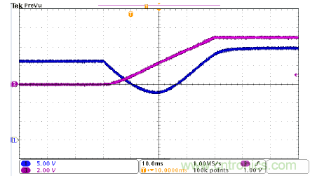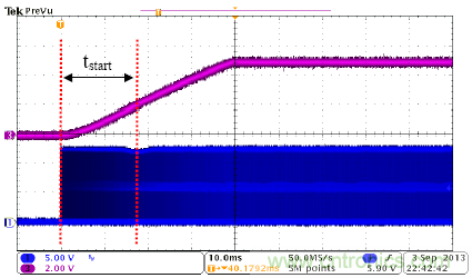 圖4是UCC28700的啟動波形,CH1是MOSFET柵極驅(qū)動信號,CH3是輸出電壓。該器件啟動順暢,沒有過沖和聲頻噪聲。該圖顯示,UCC28700器件有非常好的啟動性能。在圖4中,tstart接近18ms,與計算結(jié)果吻合。
