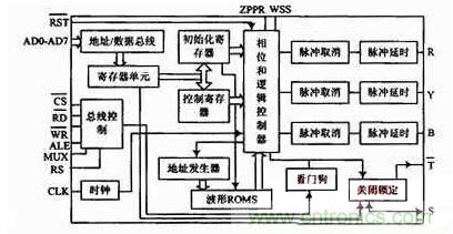 SA4828原理框圖如圖3所示。它接收并存儲(chǔ)微處理器初始化命令和控制命令,主要由總線控制、地址/數(shù)據(jù)總線、存儲(chǔ)器、控制寄存器組成,以控制字的形式實(shí)現(xiàn)。三相輸出控制電路的每相輸出控制電路由脈沖取消和脈沖延時(shí)電路構(gòu)成,脈沖取消將脈沖寬度小于取消時(shí)間的脈沖去掉,延時(shí)電路保證死區(qū)間隔,以防止在轉(zhuǎn)換瞬間橋路開關(guān)器件出現(xiàn)直通現(xiàn)象。