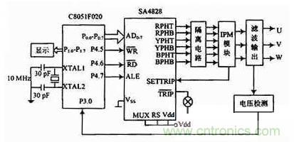 以SA4828與單片機(jī)C8051F020為核心構(gòu)成的控制器電路設(shè)計(jì)如圖4所示。控制電路根據(jù)給定的參數(shù)輸出三相SPWM信號(hào)給智能功率模塊IP-M,實(shí)現(xiàn)對(duì)功率晶體管的通斷控制。C8051F020通過8位P0端口與SA4828的地址、數(shù)據(jù)管腳AD0~AD7相連,工作時(shí),單片機(jī)首先對(duì)SA4828進(jìn)行初始化,定義載波頻率,電源頻率范圍、死區(qū)、最小脈沖取消時(shí)間等參數(shù)。然后向SA4828的控制寄存器傳送電源的頻率控制字和幅度控制字等參數(shù)。正常工作時(shí),根據(jù)需要對(duì)SA4828的控制數(shù)據(jù)進(jìn)行修改,實(shí)現(xiàn)系統(tǒng)的反饋與實(shí)時(shí)控制,以及調(diào)壓控制。為實(shí)現(xiàn)系統(tǒng)的穩(wěn)壓功能,采用平均值反饋PI調(diào)節(jié)。輸出電壓經(jīng)隔離送入C8051F020單片機(jī)的A/D轉(zhuǎn)換口即P3.0口,轉(zhuǎn)換結(jié)果參與PI運(yùn)算,運(yùn)算結(jié)果即為SA4828幅度控制寄存器的控制字。從RPHT~BPHB的6個(gè)引腳輸出相應(yīng)頻率和電壓的SPWM控制信號(hào),經(jīng)隔離電路后,分別控制智能功率模塊IPM的6個(gè)IGBT的導(dǎo)通與截止,最后在3個(gè)輸出端上產(chǎn)生對(duì)稱的三相SPWM電壓。SA4828作為單片機(jī)的外設(shè),與單片機(jī)并聯(lián),通過對(duì)單片機(jī)編程,只需將SPWM的初始化信息和控制信息寫入SA4828的相關(guān)寄存器,即產(chǎn)生精確的全數(shù)字化的三相的SPWM波形。