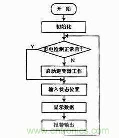 單片機(jī)在初始化程序中完成對(duì)單片機(jī)、SA4828以及其他可編程器件的初始化,接著對(duì)市電進(jìn)行檢測(cè),如果市電不正常,則啟動(dòng)逆變器工作,通過控制將開關(guān)元件切換至逆變器輸出。并將輸入狀態(tài)存入控制寄存器,顯示數(shù)據(jù),如果輸出電壓或保護(hù)等發(fā)生改變,則報(bào)警輸出以采取措施使系統(tǒng)正常運(yùn)行。