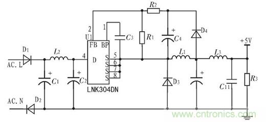 無線接收模塊由兩部分組成,供電部分由LNK304DN($0.5040)及外圍電路組成,該電路可將220 V交流電壓轉換成直流5 V電壓,分別給接收模塊和控制模塊的處理器供電,電路圖如圖3所示。