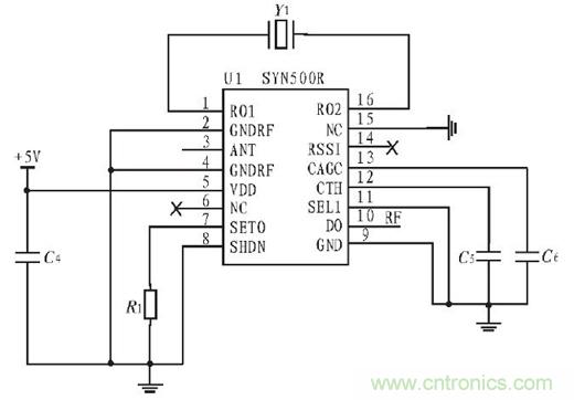 無線接收部分主要由解碼芯片SYN500R、晶振和外圍電路組成超外差接收模塊,接收模塊負責接收來自發送模塊的編碼,然后將編碼交由處理器處理,處理器處理后通過放大器將信號放大,然后控制繼電器的開和合,接收部分電路圖如圖4所示。
