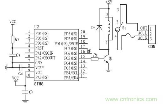 控制模塊主要由處理器單片機、繼電器和外圍元件組成開關電源,con端接入交流照明電,AC-L和AC-N分別接入交流電火線和零線,OUT端連接負載,此系統可以控制多路負載,實驗中該控制模塊連接了一個繼電器控制一路負載,控制模塊電路圖如圖5所示。