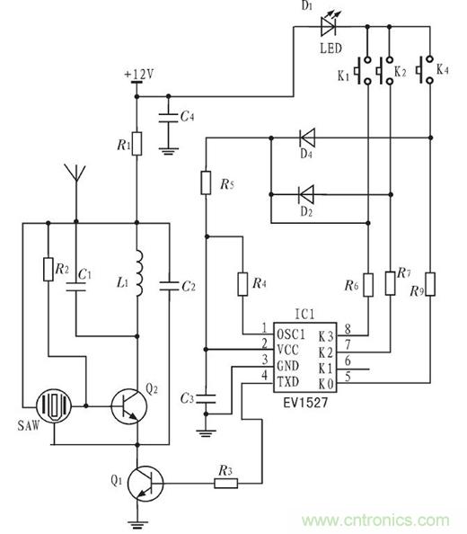 發送模塊主要由HS1527($1056.0000)無線發碼芯片、聲表面濾波器、指示燈及濾波電路等組成,發送模塊作為遙控器來操作,電路圖如圖2所示。當按下不同的按鍵K時,發碼芯片就會通過天線發出不同的編碼,編碼經過天線發送到接收模塊由接收模塊將編碼交由控制模塊解析處理,發送模塊供電電壓12 V,由電池供電。