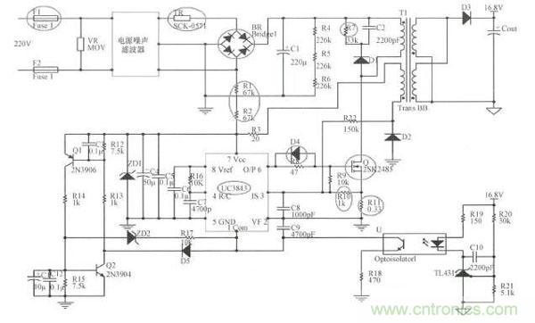 由于大部分電源故障發生在16.8 V前級輸出,故下文選取AC/DC模塊進行分析,圖3為結合實物電路板逆向繪出的電路原理圖。結合本文上面內容介紹,可以得出結論:本模塊采用了以UC3843芯片為核心的隔離型反激開關電源結構。