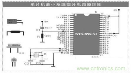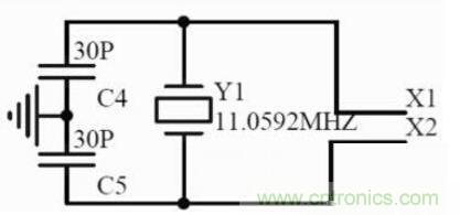 STC89C51使用11.0592MHz的晶體振蕩器作為振蕩源,由于單片機內部帶有振蕩電路,所以外部只要連接一個晶振和兩個電容即可,電容容量一般在15pF至50pF之間。