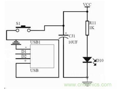 此最小系統中的電源供電模塊的電源可以通過計算機的USB口供給,也可使用外部穩定的5V電源供電模塊供給。電源電路中接入了電源指示LED,圖中R11為LED的限流電阻。S1為電源開關。