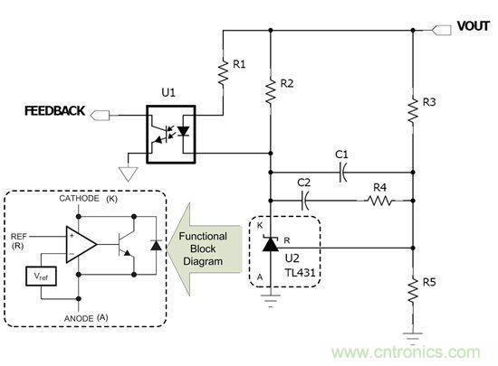 圖1:常用于調節隔離式電源輸出電壓的 TL431 電路