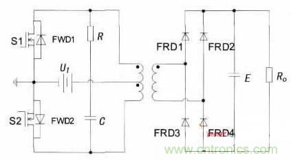 當(dāng)S1開通時(shí),其漏源電壓uDS1只是一個(gè)開關(guān)管的導(dǎo)通壓降,在理想情況下可假定uDS1=0,而此時(shí)由于在繞組中會(huì)產(chǎn)生一個(gè)感應(yīng)電壓,并且根據(jù)變壓器初級(jí)繞組的同名端關(guān)系,該感應(yīng)電壓也會(huì)疊加到關(guān)斷的S2上,從而使S2在關(guān)斷時(shí)承受的電壓是輸入電壓與感應(yīng)電壓之和約為2UI.在實(shí)際中,變壓器的漏感會(huì)產(chǎn)生很大的尖峰電壓加在S2兩端,從而引起大的關(guān)斷損耗,變換器的效率因受變壓器漏感的限制,不是很高。在S1和S2的漏極之間接上RC緩沖電路,也稱為吸收電路,用來抑制尖峰電壓的產(chǎn)生。并且為了給能量回饋提供反饋回路,在S1和S2兩端都反并聯(lián)上續(xù)流二極管FWD.