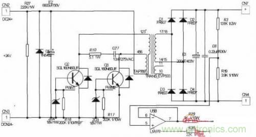 圖5為簡(jiǎn)化后的主電路。輸入24V直流電壓,經(jīng)過大電容濾波后,接到推挽變壓器原邊的中間抽頭。變壓器原邊另外兩個(gè)抽頭分別接兩個(gè)全控型開關(guān)器件IGBT,并在此之間加入RC吸收電路,構(gòu)成推挽逆變電路。推挽變壓器輸出端經(jīng)全橋整流,大電容濾波得到220V直流電壓。并通過分壓支路得到反饋電壓信號(hào)UOUT.