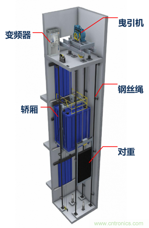 傳統(tǒng)電梯的動力部分主要由曳引機(jī)(卷揚機(jī))、變頻器、轎廂、鋼絲繩、對重組成。曳引機(jī)通過卷動鋼絲繩,調(diào)節(jié)轎廂和對重的平衡,實現(xiàn)對轎廂高度的控制,即電梯的上下。其中曳引機(jī)本質(zhì)就是一臺由變頻器驅(qū)動與控制的大功率電機(jī),需要安置在大樓頂層——這就造成了電梯無法上頂層的問題了,因為頂層的電梯位置被曳引機(jī)和變頻器占據(jù)了。這問題一直存在了很久的時間,因為過去曳引機(jī)基本都用交流異步電機(jī),且功率輕松上幾十KW,體積非常大,且不能露天放置,只能一直占著頂樓的房間。