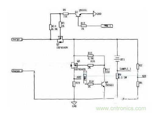 根據(jù)三路AD采樣結(jié)果確定充電器的充電狀態(tài)后,由單片機(jī)輸出兩路占空比可調(diào)頻率為1kHz的PWM波形PWM1和PWM2分別用來控制兩只三極管2N5551的導(dǎo)通程度,三極管集電極電流會(huì)隨著不同,再經(jīng)電阻分壓后提供不同的電壓給場(chǎng)效應(yīng)管的柵極,驅(qū)動(dòng)MOSFET,輸出不停大小的漏極電流Id,給蓄電池提供大小不等的充電電流和放電脈沖幅值,最終達(dá)到脈沖充電的效果。