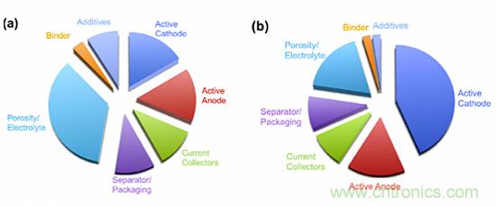 現在鋰離子電池各組分的(a)體積占比和(b)質量占比