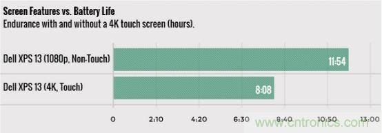 拋開電池技術本身止步不前的原因,筆記本電腦電池壽命沒有進步的主要原因在于其他硬件發展。雖然處理器每一年都在功耗方面擁有一定進步,但4K屏幕、觸摸屏、超輕薄設計,對電池壽命都產生了消極的影響。以戴爾XPS 13為例,1080P非觸摸屏版本相比4K觸摸屏版本的電池壽命長了約4小時。