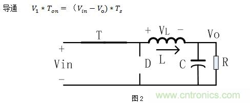 當(dāng)PWM驅(qū)動(dòng)高電平使得NMOS管T導(dǎo)通的時(shí)候,忽略MOS管的導(dǎo)通壓降,等效如圖2,電感電流呈線(xiàn)性上升,MOS導(dǎo)通時(shí)電感正向伏秒為: