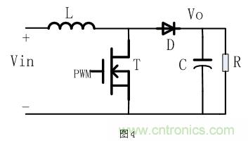 Boost升壓型電路拓?fù)洌袝r(shí)又稱(chēng)為step-up電路,其典型的電路結(jié)構(gòu)如下圖4所示: