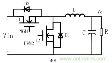 當(dāng)T2管截止時(shí),T1管與D1、L等器件構(gòu)成了Buck型降壓電路,可以實(shí)現(xiàn)對(duì)后級(jí)的負(fù)載進(jìn)行供電;反之,當(dāng)T1管截止,T2管與D2二極管、L等器件構(gòu)成了Boost升壓電路,對(duì)前端電源進(jìn)行能量補(bǔ)充。目前對(duì)T1和T2管的控制以模擬方式控制相對(duì)還是比較困難,均是以數(shù)字控制方式為主。