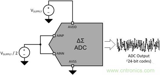如圖1所示,你可以用短接至中電源電壓的正負輸入來指定和測量一個ADC的DC噪聲性能。通過測量這個條件下的噪聲,ADC輸出代碼內的噪聲幾乎不受基準電壓、基準噪聲或輸入信號噪聲變化的影響。雖然這個測試條件相對于實際應用來說是一個過于理想的情況,它的確較好地給出了一個不受某些外部噪聲源影響的ADC噪聲性能。