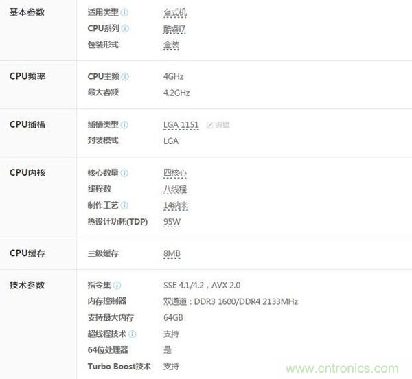 CPU一般由三部分組成:邏輯運算單元、控制單元和存儲單元組成。我們看一下Intel i7 6700k具體參數: