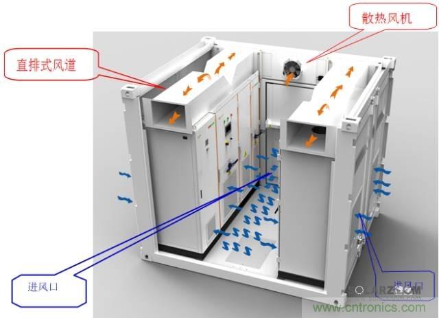 陽光電源箱式逆變房將逆變器、直流柜、通訊單元集成于一體,采用簡(jiǎn)潔的分段直排式風(fēng)道,風(fēng)道內(nèi)不含風(fēng)機(jī),零損耗,免維護(hù)。風(fēng)道長(zhǎng)度僅1m,壓力損失小,風(fēng)機(jī)處于最佳效率狀態(tài)。逆變器在工作時(shí),大部分熱量通過風(fēng)道排出集裝箱外,僅有少量熱量通過輻射傳到箱體內(nèi)部,內(nèi)部空氣吸收熱量后向頂部流動(dòng),再由集裝箱頂部排風(fēng)扇排出,確保了逆變器的長(zhǎng)期可靠運(yùn)行。