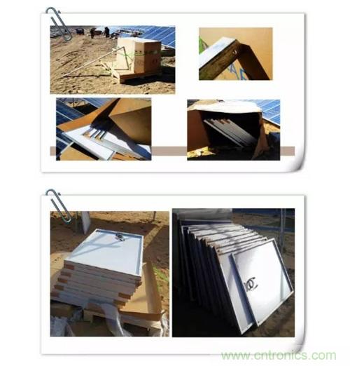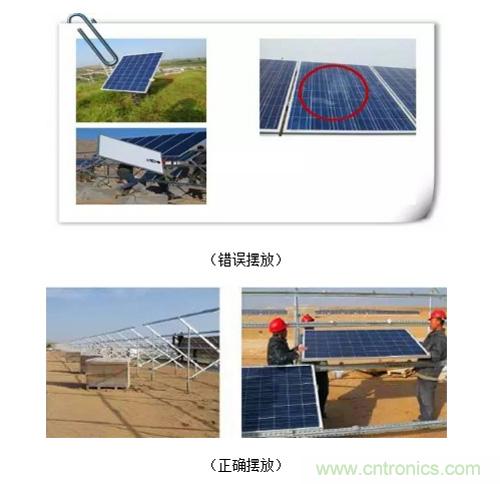 2、組件運抵安裝位置后,應斜靠在已安裝完成的支架橫梁上,避免平鋪在地上。