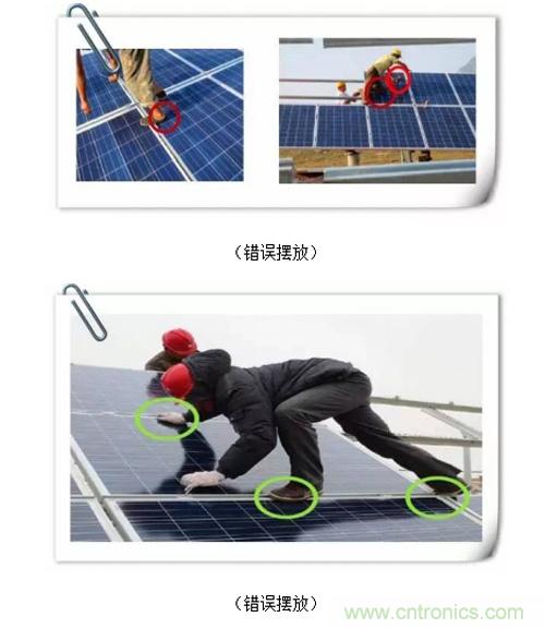 2、組件安裝過程中,應盡量避免安裝工人在組件上直接落腳進行操作,若必須上人,工人落腳點及手扶著力點只能是組件邊框上。