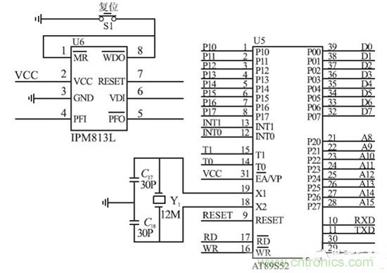 單片機最小系統圖如圖3 所示。MCU 選用ATMEL公司的AT89S52 單片機。AT89S52 是一種低功耗、高性能的CMOS 工藝的8 bit 單片機,與標準MCS51 的引腳和指令完全兼容。其外接晶振頻率范圍為0 Hz ~33 MHz,內置256 B 片內RAM,3 個16 位定時器/ 記數器,片內看門狗。其性能好于我們常用的89C52 系列單片機。