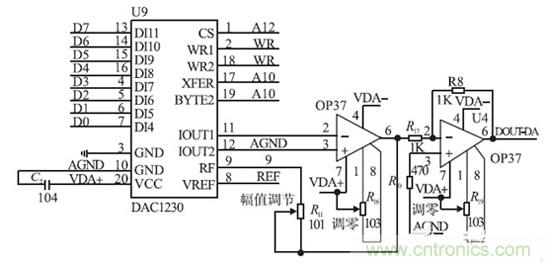 D/ A 控制輸出電路如圖5 所示。該單片機的輸入信號為經過12 bit 的A/ D 轉換器的數字量,送入單片機處理后產生輸出數字量經D/ A 轉換后送入恒流源,因而這種數控恒流源的精度最終取決與電路中A/ D 和D/ A 轉換器的轉換精度。