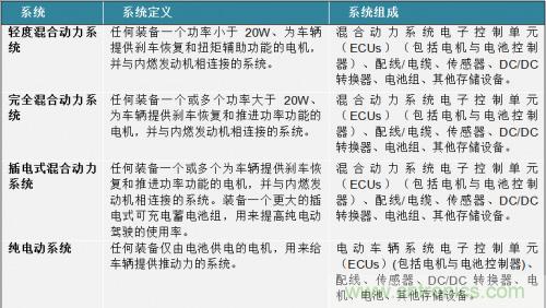 隨著世界范圍的人們對更高能源效率的交通方式的需求增加,HEV/EVs將首當其沖,成為人們的首要選擇的交通方式。為了更好的了解電動與混合動力車輛市場的潛力與發展情況,我們不可避免的要知道在本文中提到的是什么類型的車輛。在Strategy Analytics[1]的報告中:“2007年到2021年混合動力車輛系統的需求預測,”將HEV/EV分為四類: