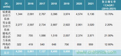 如表1所示,每部車輛都可能搭載1到4個電機。(搭載4個電機是出于每個輪胎都需要一臺電機)。每臺使用的電機都將需要搭配合適的系統,以安全高效地驅動與控制這些電機。這些系統需要具備控制可見性和粒度,以實現合適的扭矩與電機控制。牢記電機與其控制系統需要的知識,表2(同樣來自Strategy Analytics的報告)給2015-2021期間市場上的每種類型車輛的數量一個估計值