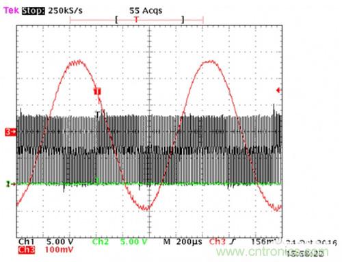 直列式電流感應方法看似是最合理的,因為這是最終要測量的電流。但這種方法存在一個問題。驅動MOSFET或IGBT的PWM信號對電流感應放大器造成嚴重破壞。感測電阻處的共模信號從電源電壓被驅動到接地,具有非??焖俚乃矐B開關特性,而電流感應放大器試圖測量感測電阻本身的小差分信號。圖2是由PWM逆變器產生的正弦相電流(紅色波形)的示波器截圖。這種情況下,PWM頻率為100兆赫(MHz),由LMG5200 GaN半橋功率級提供(更多詳細信息,請參見底部的TI設計)。需要注意的是,快速開關信號是直列式電流感應放大器測量相電流時所接收的信號。這就像在有颶風的情況下,當杯子在海上漂浮,而試圖測量杯中液體一樣。難怪大多數設計師會考慮使用低側感應!下面我們將介紹另外一種方法。