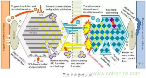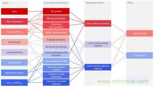 下面我們就來了解以下,為什么鋰離子電池在使用的過程中,會發(fā)生衰降呢?首先我們必須清楚,在鋰離子電池的內(nèi)部,除了正常的鋰離子嵌入和脫嵌正負極的反應(yīng),還會存在很多副反應(yīng),例如SEI膜的生成和生長,電解液分解,粘結(jié)劑分解,正負極活性物質(zhì)破裂等等因素,都會造成鋰離子電池的容量下降。雖然造成鋰離子電池衰降的因素很多,但是歸結(jié)起來可以分為三個大類:1)鋰損失,由于鋰離子電池是一個封閉系統(tǒng),內(nèi)部的物質(zhì)是恒定的,SEI膜的生成、破壞,負極析鋰等都會消耗僅有的Li資源;2)正極活性物質(zhì)損失,在鋰離子電池使用的過程中往往會發(fā)生正極材料顆粒破碎,粘結(jié)劑分解和正極材料晶體結(jié)構(gòu)改變等因素,這些都會導(dǎo)致一部分正極活性物質(zhì)失去嵌鋰等能力;3)負極活性物質(zhì)損失,例如負極活性物質(zhì)脫落,粘結(jié)劑分解等因素,都會導(dǎo)致部分負極活性物質(zhì)顆粒失去與導(dǎo)電網(wǎng)絡(luò)的導(dǎo)電連接,從而使其無法嵌鋰,造成鋰離子電池容量損失。