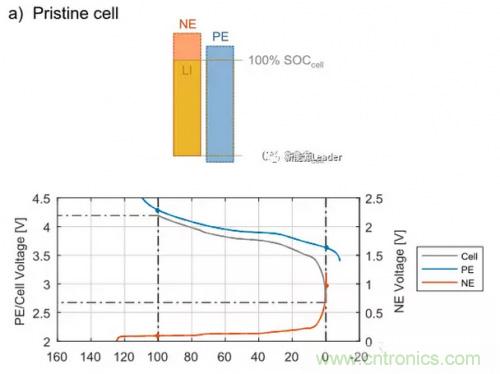 首先Christoph R. Birkl根據(jù)扣式電池極片的面積計算得到了扣式電池的理論容量,然后通過對正極極片進行充電脫鋰模擬了不同程度的鋰鋰離子損失,通過對負極極片進行裁切模擬了負極活性物質(zhì)損失,對正極極片裁切模擬了正極活性物質(zhì)損失。為了對試驗結(jié)果進行分析,Christoph R. Birkl利用柱狀圖建立了一個物理模型,如上圖所示,其中左側(cè)為負極的SoC狀態(tài),右側(cè)為正極的SoC狀態(tài),上圖模型為正常電池的模型,從圖上可以看到在正常電池設(shè)計中,一般會負極的容量設(shè)計的稍微高一些,這一般稱作正負極冗余,適當?shù)娜哂嗫梢员WC鋰離子電池循環(huán)性能,也能在鋰離子電池發(fā)生過充的情況下能夠容納足夠的鋰,確保鋰不析出,保證電池的安全性。