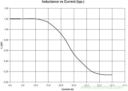 電感中直流電流的增加時,電感透磁率的數(shù)值會逐漸減少,因此電感值會緩慢下降。電感廠商會根據(jù)電感的電感值的下降程度為指標(biāo)的額定電流,"基于電感值的變化率的額定電流",即Saturation Current,大部分電感廠商將電感值下降20%時的通過電感直流電流作為額定電流。下圖是Wurth公司某款電感的電感值vs電流的曲線圖。該款電感規(guī)格書上將saturation current設(shè)定為電感值下降10%時的電流值,為16.6A。如果將saturation current設(shè)定為電感值下降20%時的電流值的話,大約為18.2A。
