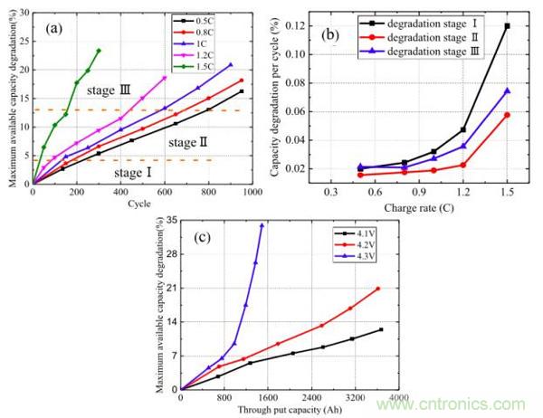 鋰離子電池的放電制度很大程度上依賴于使用者,好的放電制度對于有的使用者而言并不一定適用。但是充電制度則主要是設計者進行控制,因此對于充電制度對電池壽命衰降的影響的研究,能夠更好的指導我們對鋰離子電池的設計。北京交通大學的YangGao等針對不同的充電制度對鋰離子電池壽命衰降的影響,并研究了其作用機理,提出了鋰離子電池的壽命衰降模型。YangGao的研究顯示,當充電電流和截止電壓超過一定的數值時,鋰離子電池的衰降將被極大的加速,為了降低鋰離子電池的衰降速率,需要針對不同的體系,選擇合適的充放電電流和截止電壓。