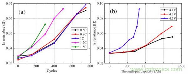 對電池的動態內阻分析如下圖所示,從圖a測試結果來看,當充電電流小于1C時,電池動態內阻隨著電池循環的變化趨勢幾乎時一樣的,但是當充電電流超過1C時,電池動態內阻增加速度會隨著充電速率的增加而快速增加。從圖b的測試結果來看,當充電截止電壓為4.3V時,電池動態內阻增加非常迅速表明高截止電壓會惡化電池的動力學條件,截止電壓為4.1V和4.2V時電池動態內阻增加較為緩慢。