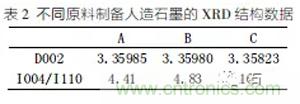 圖4是不同原料、相同制備工藝制成的三種人造石墨A、B、C的XRD圖譜,由圖4可知:A、B、C三種材料的主峰位置基本相同,均位于26°2θ角附近,說(shuō)明經(jīng)過(guò)高溫石墨化處理后的A、B、C三種材料形成了石墨晶體的六方晶型結(jié)構(gòu)。