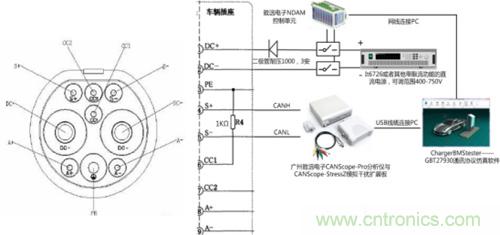 · K5、K6控制單元:驅(qū)動(dòng)上述繼電器,與協(xié)議模擬器配合,在充電過程進(jìn)入充電配置階段時(shí)實(shí)現(xiàn)繼電器吸合,進(jìn)而使充電樁檢測(cè)到模擬電池電壓。本文推薦選擇致遠(yuǎn)電子的NDAM-9000與NDAM-2808組成的控制單元,可以通過網(wǎng)口與CANScope實(shí)現(xiàn)聯(lián)動(dòng)。