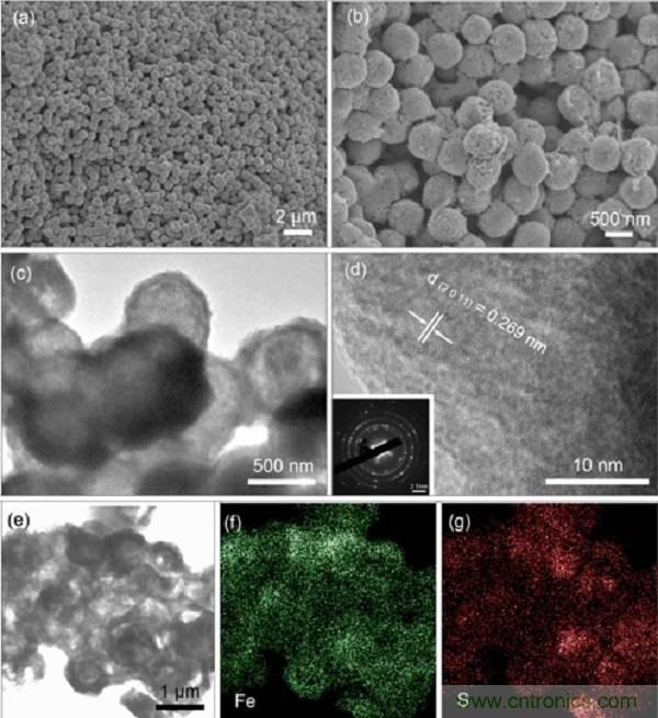 (a,b)Fe1-xS納米材料在不同放大倍率下的掃描電子顯微鏡(SEM)圖像;(c,d)Fe1-xS納米材料的投射電子顯微鏡(TEM)圖像,插圖:電子衍射圖像;(e-g)Fe1-xS納米材料各元素的EDX面掃描圖。