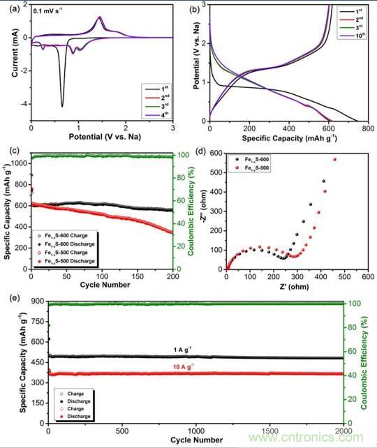 Fe1-xS納米材料的(a)CV圖;(b)充放電曲線圖;(c)循環穩定曲線;(d)交流阻抗圖;(e)不同充放電倍率下循環穩定性曲線。