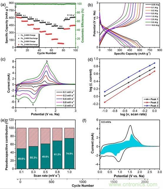 Fe1-xS納米材料的(a)倍率性能曲線;(b)相應倍率下充放電曲線;(c)不同掃速下的CV曲線;(d)相應氧化還原峰下的log i vs. log v曲線;(e)不同掃速下的贗電容貢獻;(f)掃速為0.5 mV s-1時,CV曲線及相應贗電容所占比例。