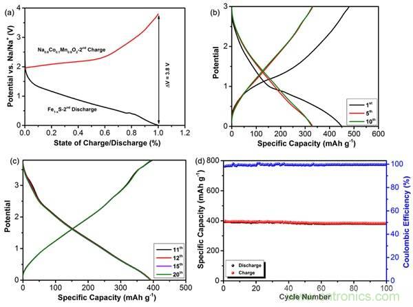 (a)Na0.6Co0.1Mn0.9O2正極和Fe1-xS負極充放電曲線對比;Na0.6Co0.1Mn0.9O2/Fe1-xS全電池在電流密度20 mA g-1時的電化學性能(b,c)充放電曲線;(d)循環穩定性曲線。